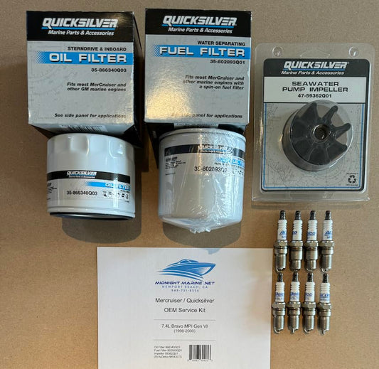 Midnight Marine OEM Service Kit 7.4L 454 Bravo MPI Gen VI (L29) 1998-2000 Quicksilver Mercruiser: Fuel & Oil Filter(s), Impeller, and Spark Plugs